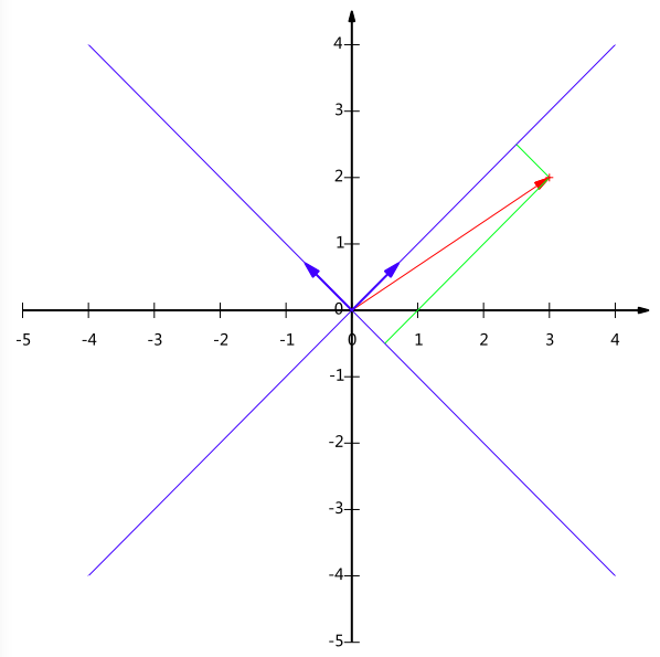 ( 5 2 √ , − 1 2 √ ) (52,−12) 。下图给出了新的基以及(3,2)在新基上坐标值的示意图: